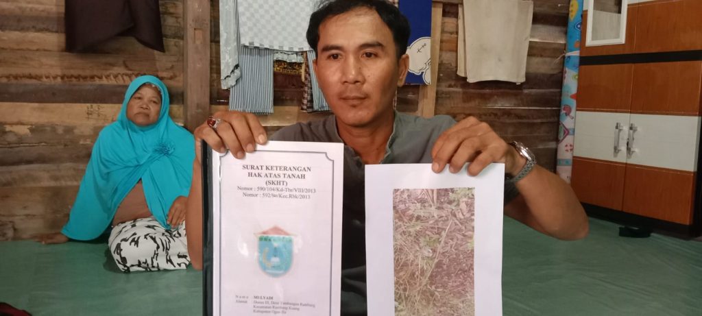 Bustomi (46) perlihatkan surat hak milik atas lahan kebun miliknya yang diduga tercemar limbah minyak padat berlokasi Tanjung Tiga Timur(TTT)