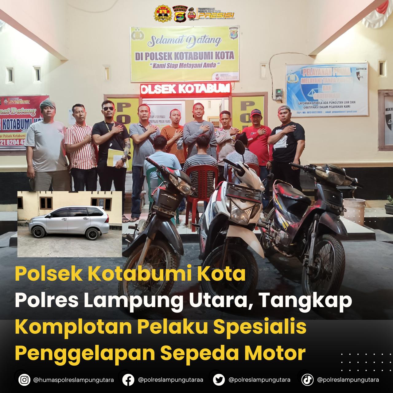 Komplotan Pelaku kejahatan spesialis penggelapan sepeda motor di sejumlah lokasi di Kabupaten Lampung Utara yang meresahkan warga akhirnya diringkus aparat Polsek Kotabumi Kota Polres Lampung Utara.